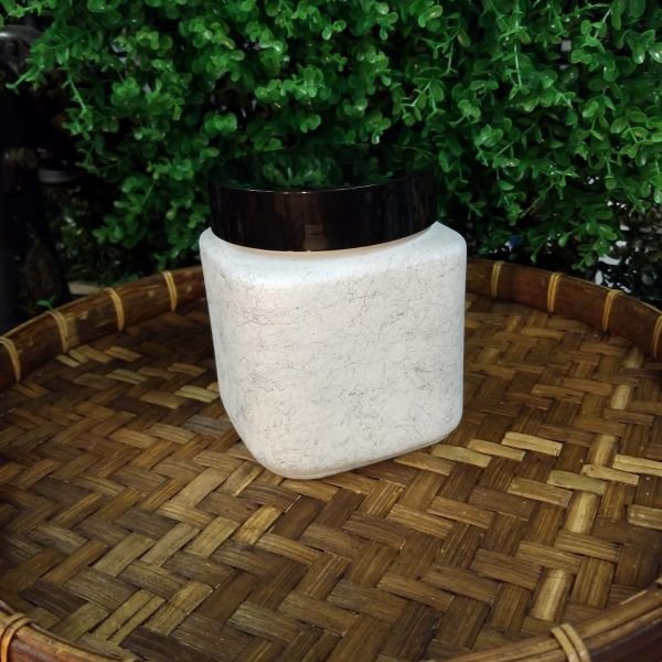 Frasco de vidrio rectangular con esquinas redondeadas símil mármol con tapa a rosca.