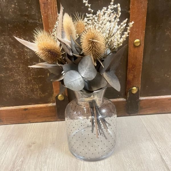 Frasco / florero de vidrio con tapa estilo lechero antiguo con lunares de 11 x 17 cm