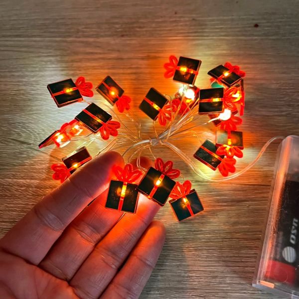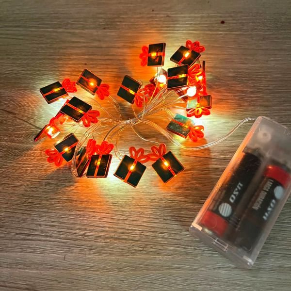 Guirnalda de 20 regalitos con luces led cálida, distribuidos en 2 metros Funciona con 2 pilas AA y tiene tecla de encendido y apagado