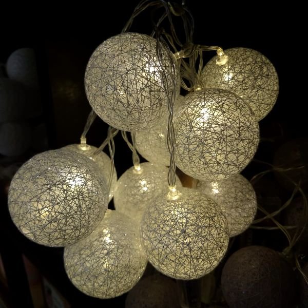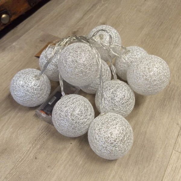 Guirnalda de 10 esferas de hilo plateado 2 mt luz led cálidas.
