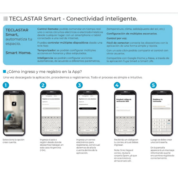Capacidad: 2200VA-10A. 220V / 50Hz. Control remoto con APP “TECLASTAR / SMARTLIFE” gratuita para iOS y Android compatible con Echo Alexa y Google.