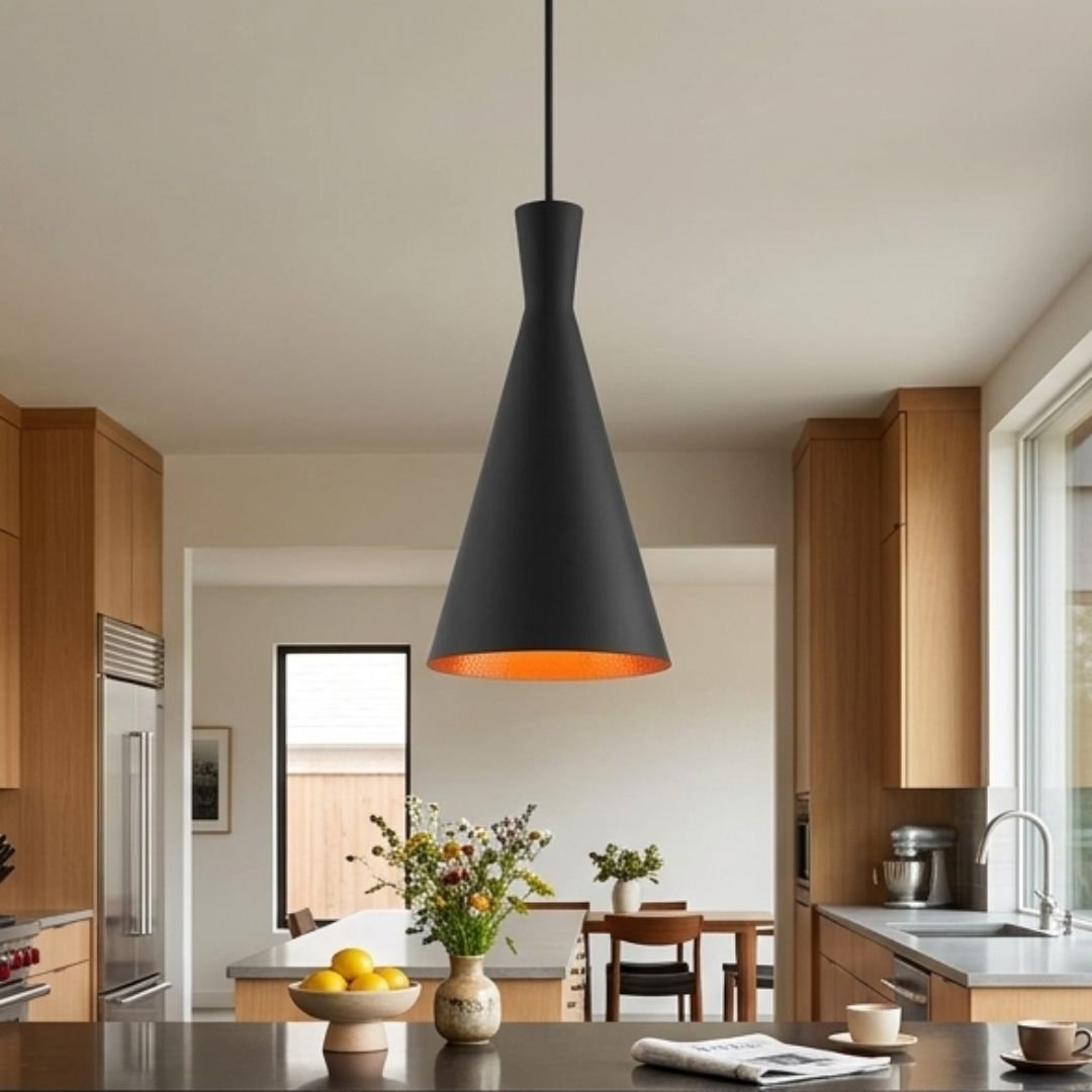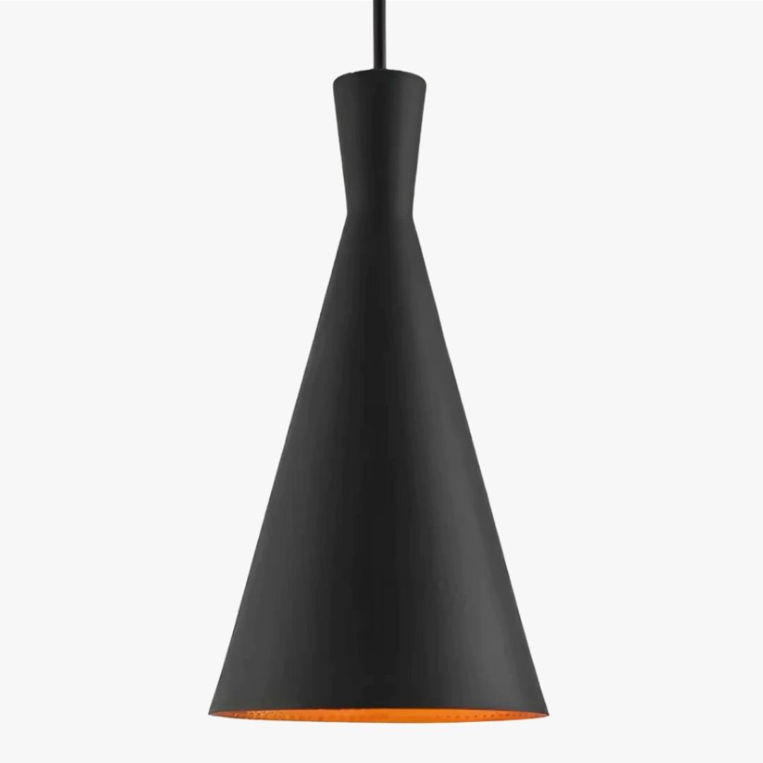 Lámpara colgante de chapa negra con interior tipo cobre.