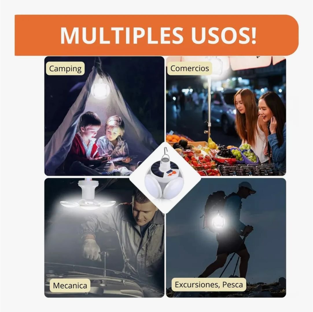 Ideal para transportarla a cualquier lugar. Puede recargarse a través de sus pequeñas celdas solares o directamente a la corriente. Bajo consumo de energía, alto brillo, rendimiento estable. Su estado máximo de iluminación entrega hasta 30W y puede cubrir hasta 80MT.