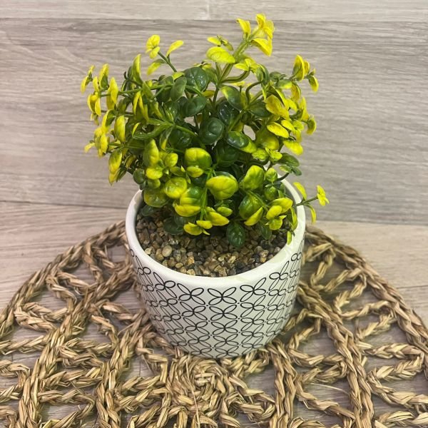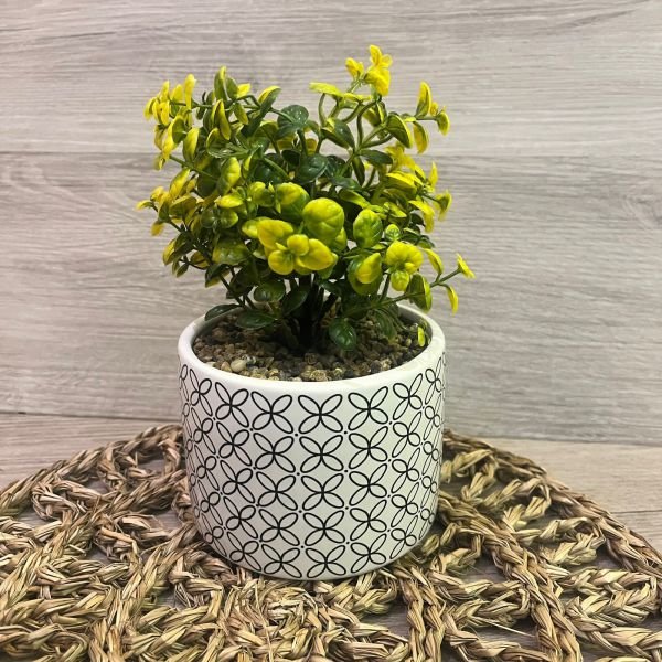 Maceta decorativa de cerámica blanca pintada con planta artificial