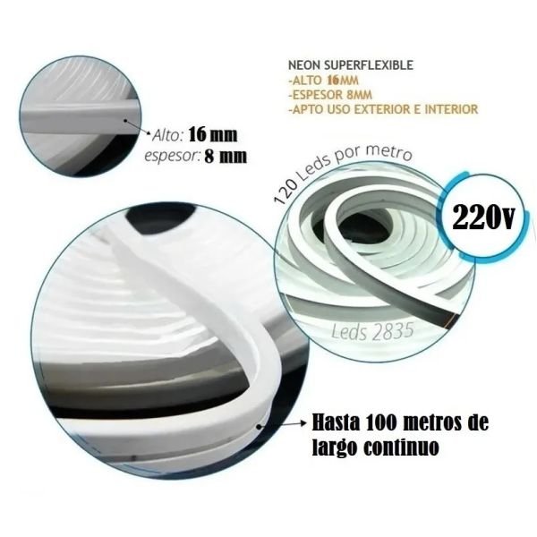 Neón de led flexible a 220V CC MONOCOLOR, con un índice de protección de IP67, van en rollos de 100 metros, con 8.5W x metro de potencia. Se conecta directamente a la red eléctrica 220V AC mediante un cable rectificador controlador que NO se incluye en el producto, ni el conector. El Neón de LED se puede cortar cada metro por su zona habilitada.