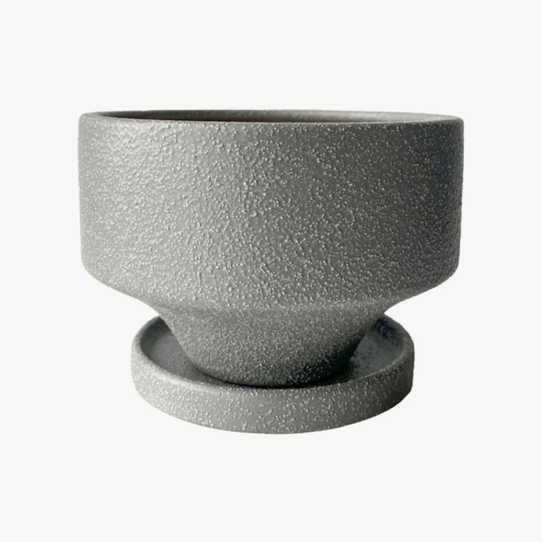 Mini maceta de cerámica gris texturada con orificio para desagote