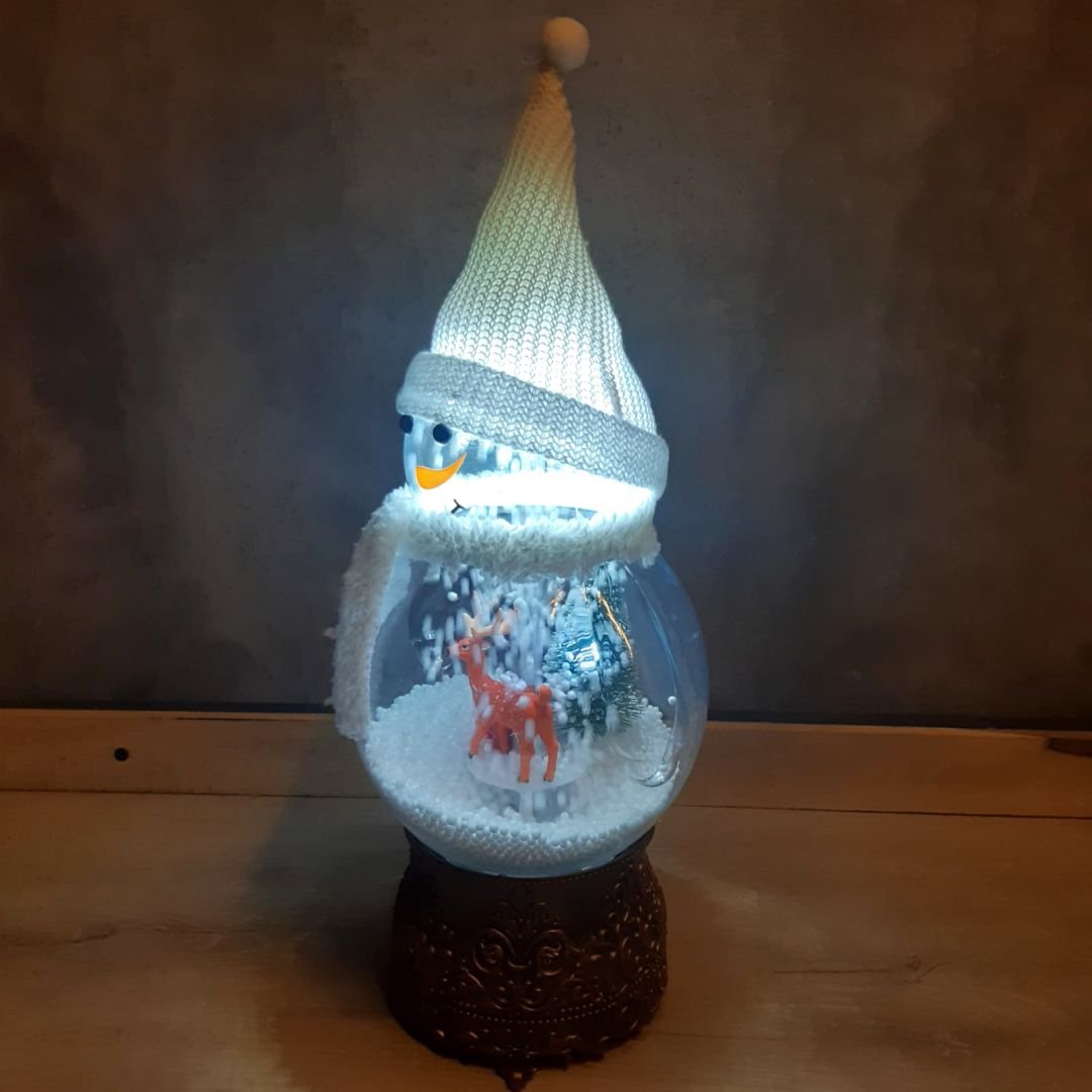 Muñeco / Farol de nieve con luz led, lluvia de nieve automatica y musica de 36 cm