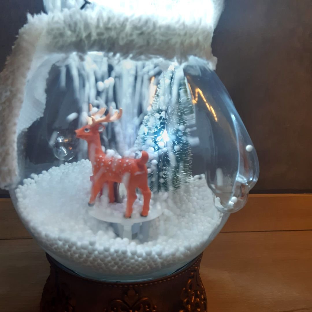Adorno navideño en forma de cúpula con arbolito y muñeco de nieve.