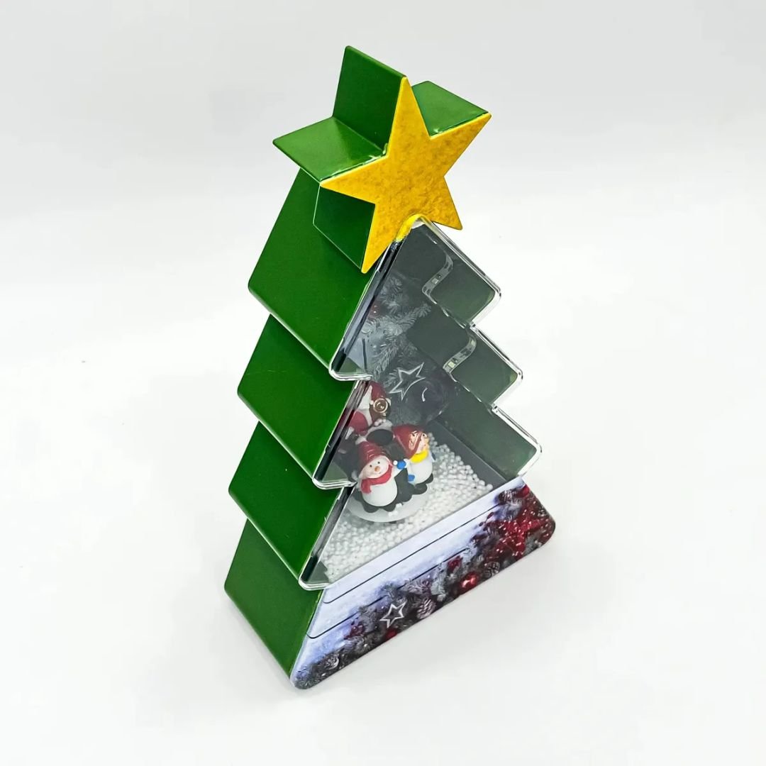 Este adorno con forma de pino es ideal para colocar en el hogar en épocas navideñas. Cuenta con un diseño llamativo y colorido que al prenderse comenzará a hacer un efecto de que está nevando dentro gracias a su motorcito que está en la parte trasera.