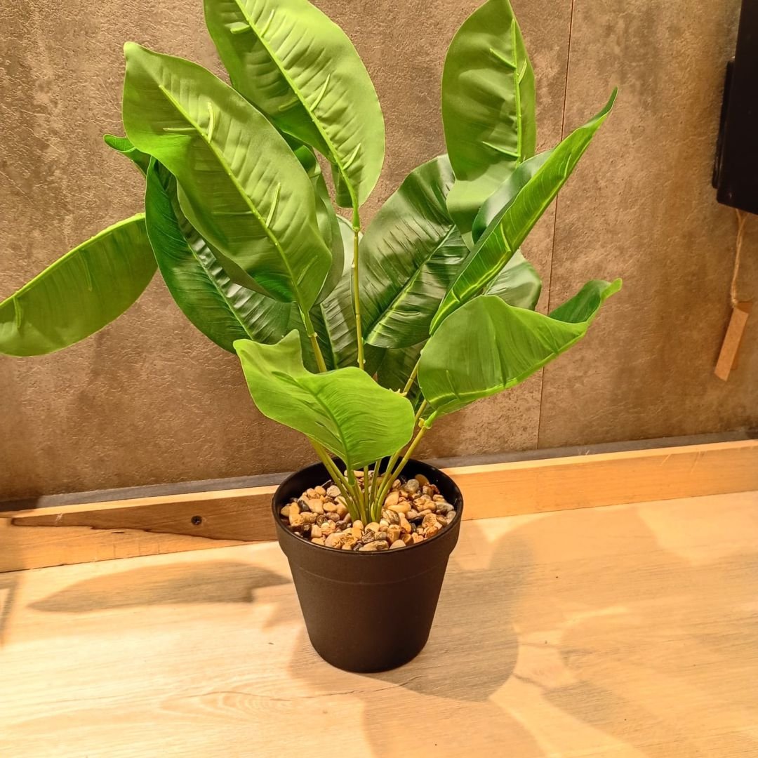 Planta artificial de hojas verdes en maceta de pvc redonda con piedritas decorativas