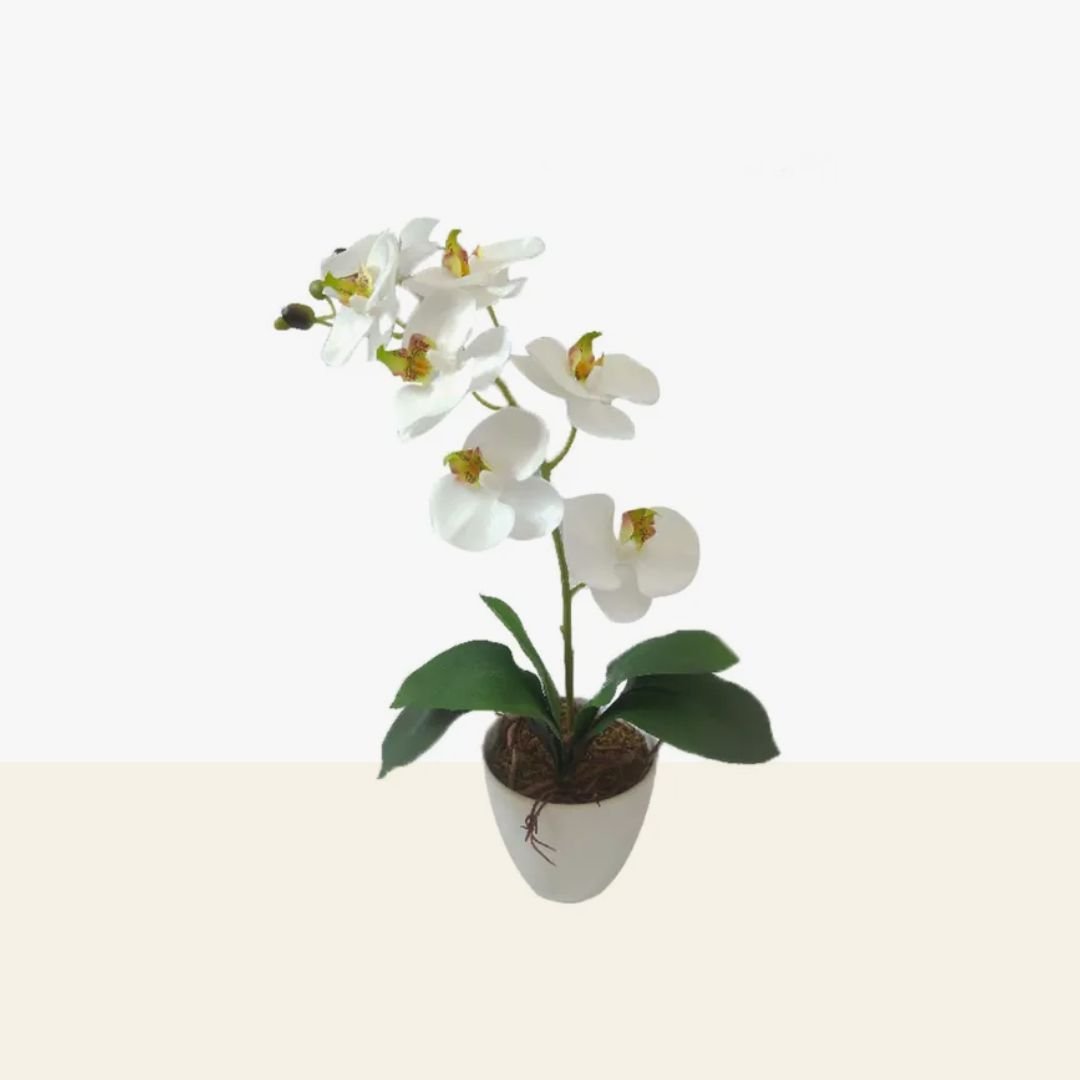 Planta de flores blancas artificial en maceta blanca de pvc con base de tierra
