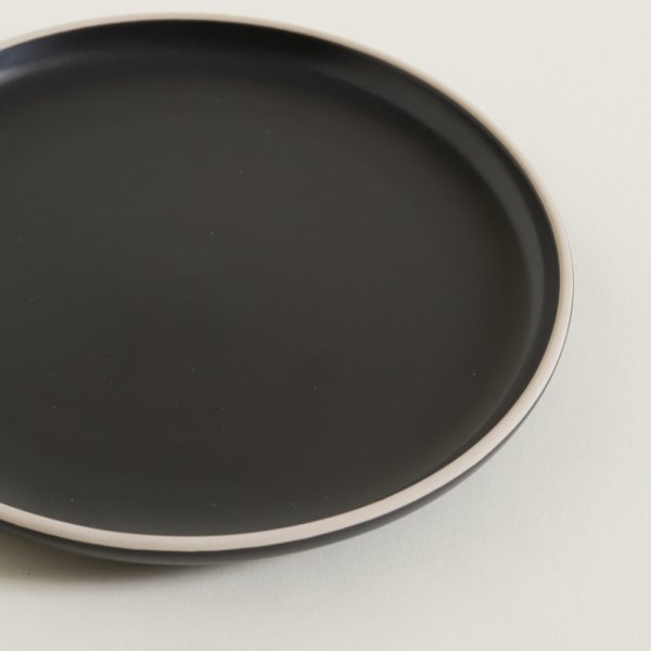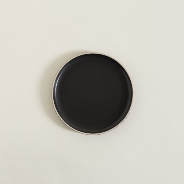 Plato de mesa redondo color negro mate con una terminación de borde color beige.