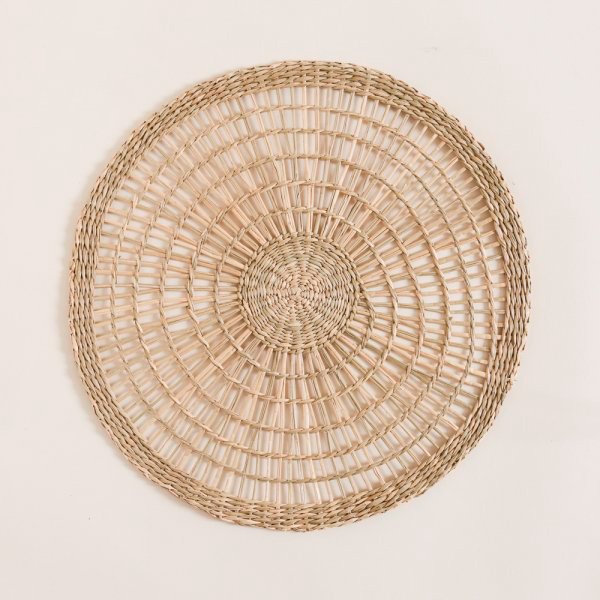 Individual redondo de fibra natural trenzado con mucho diseño.