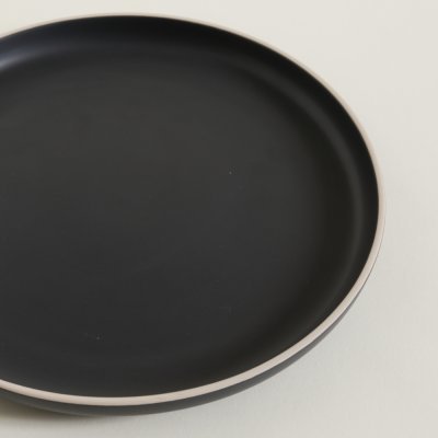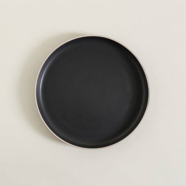 Plato de mesa redondo color negro mate con una terminación de borde color beige.