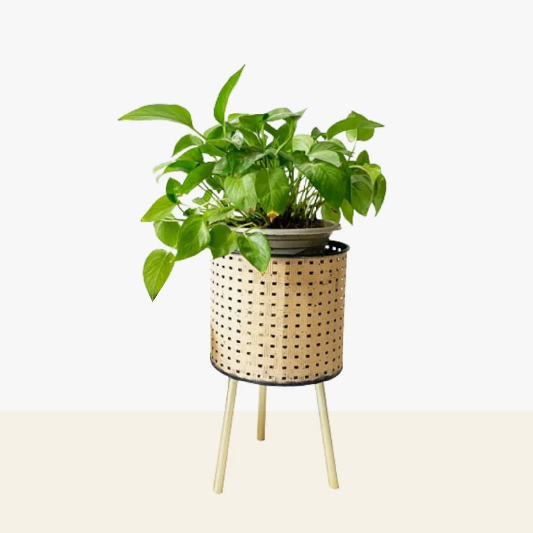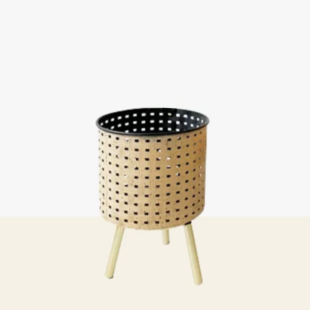 Porta maceta de metal beige calado grande con pies de madera