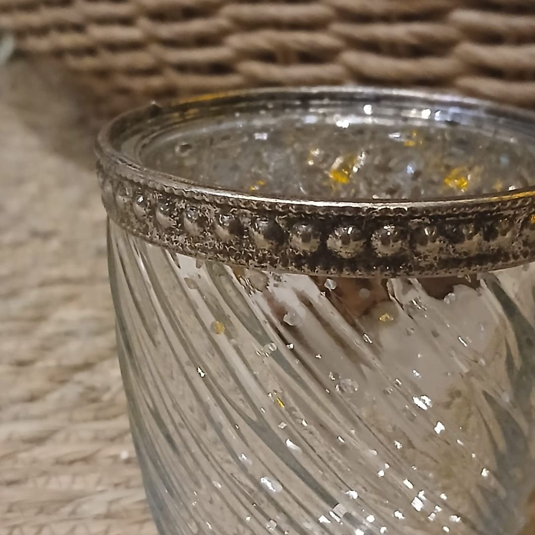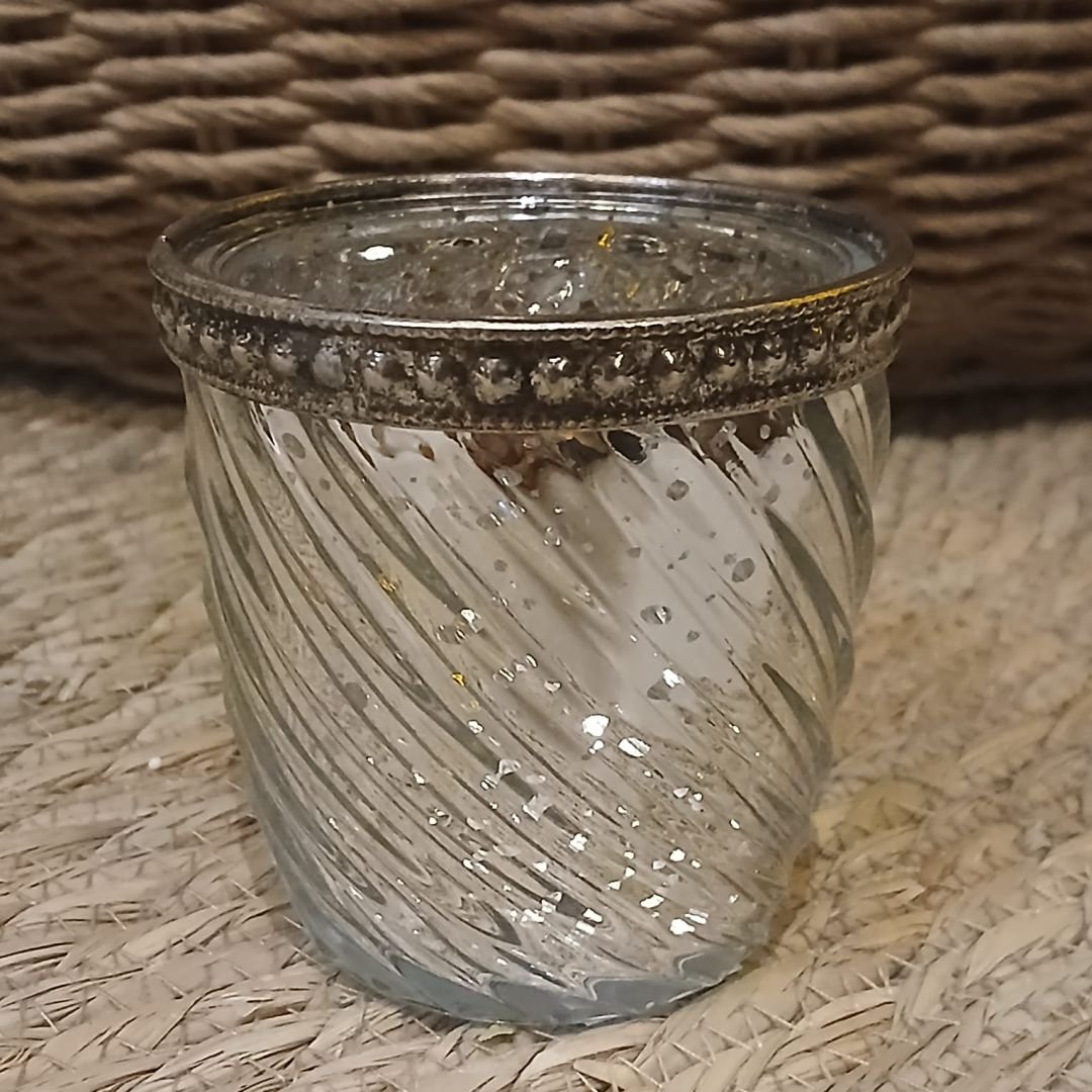 Posa vela chico de vidrio labrado metalizado de 6,5 x 6,5 x 7 cm