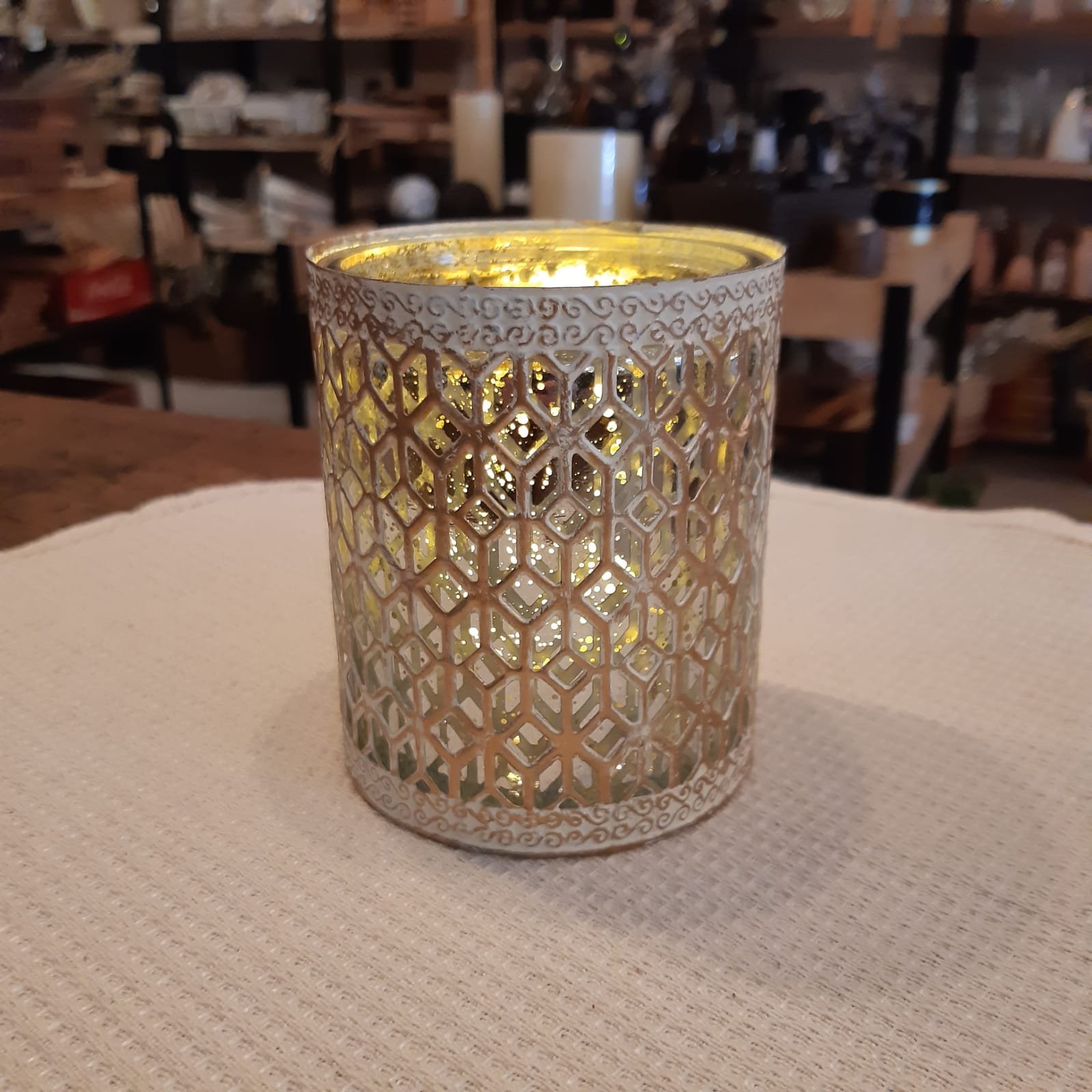 Posa vela de vidrio con metal labrado blanco