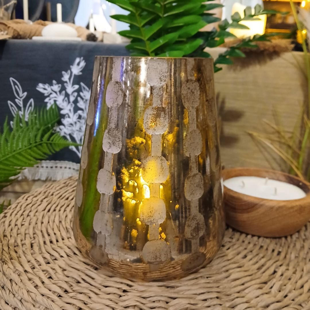 Posa vela grande de vidrio conico estampado metalizado de 19 cm