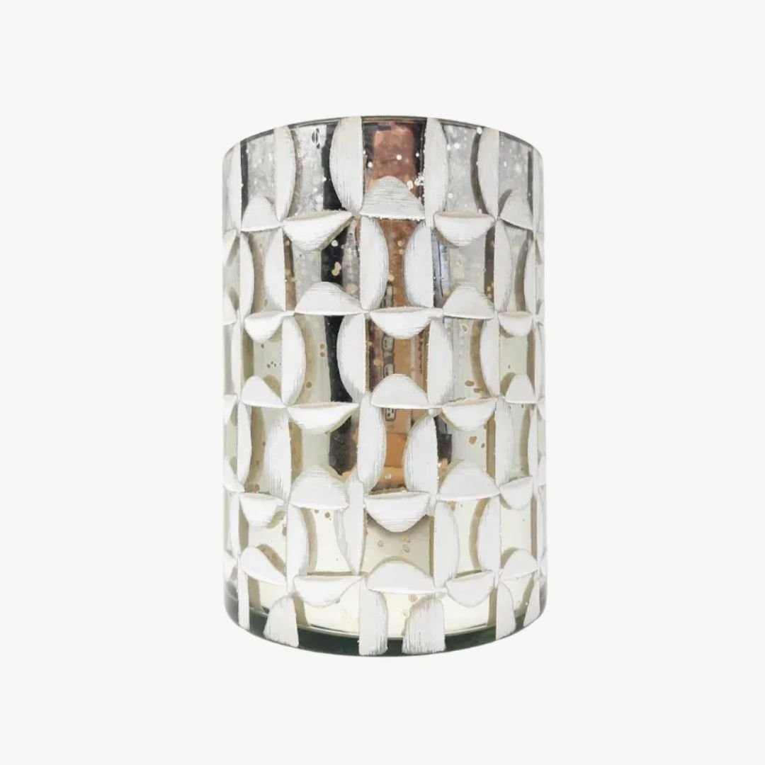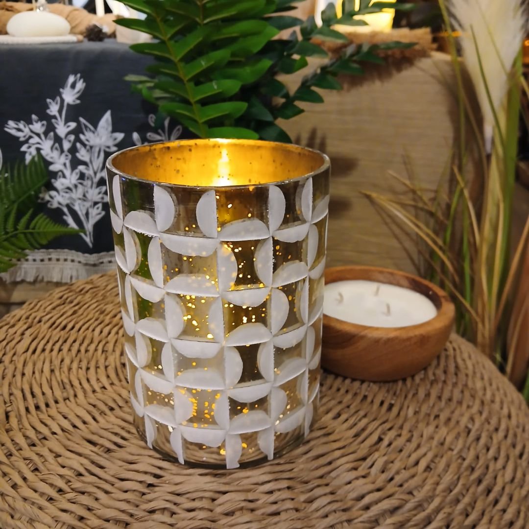 Posa vela de vidrio estampado metalizado dorado y blanco de 17 cm