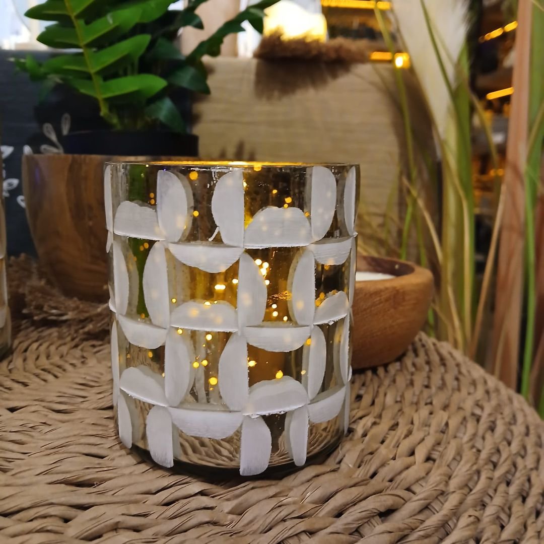 Posa vela de vidrio estampado metalizado dorado y blanco de 10 cm