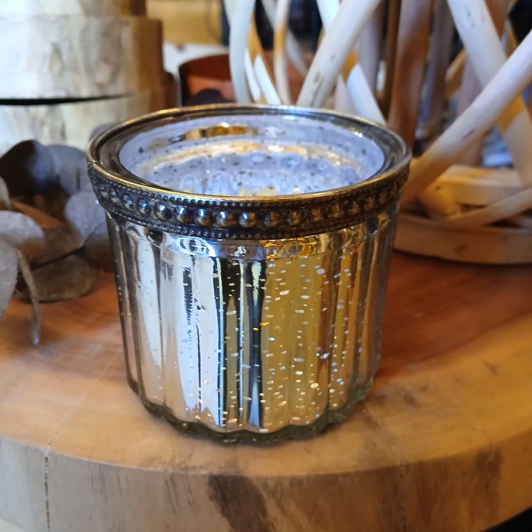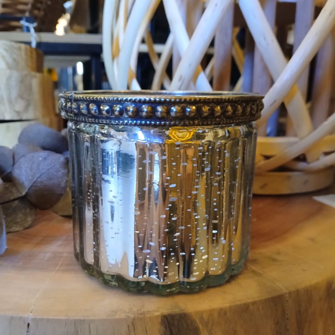 Posa vela de vidrio labrado metalizado plateado de 8 x 8 x 6 cm