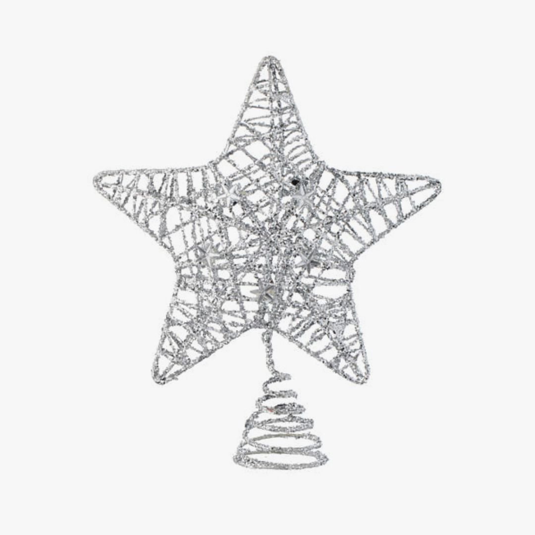 Puntal estrella para arbol de navidad blanco calado con glitter plateado de 16 cm