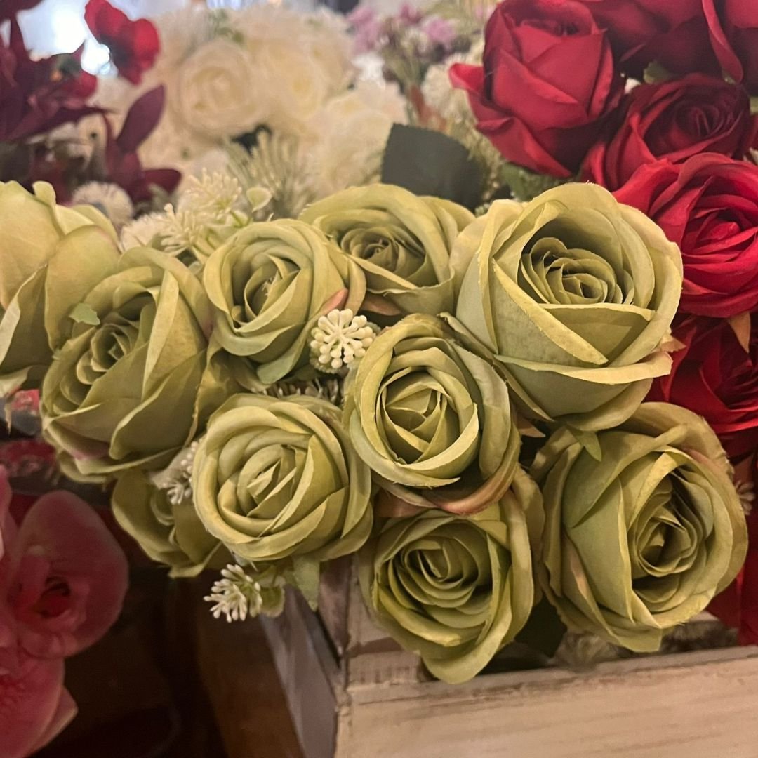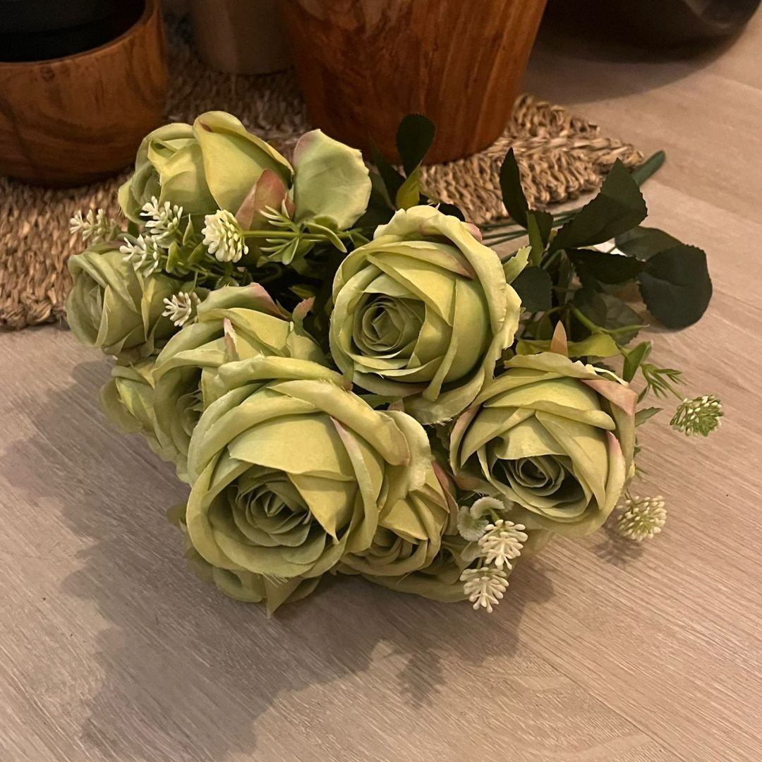 Ramo tupido de 12 rosas verdes artificiales y hojas. Ideal para decorar cualquier rincón de tu hogar.