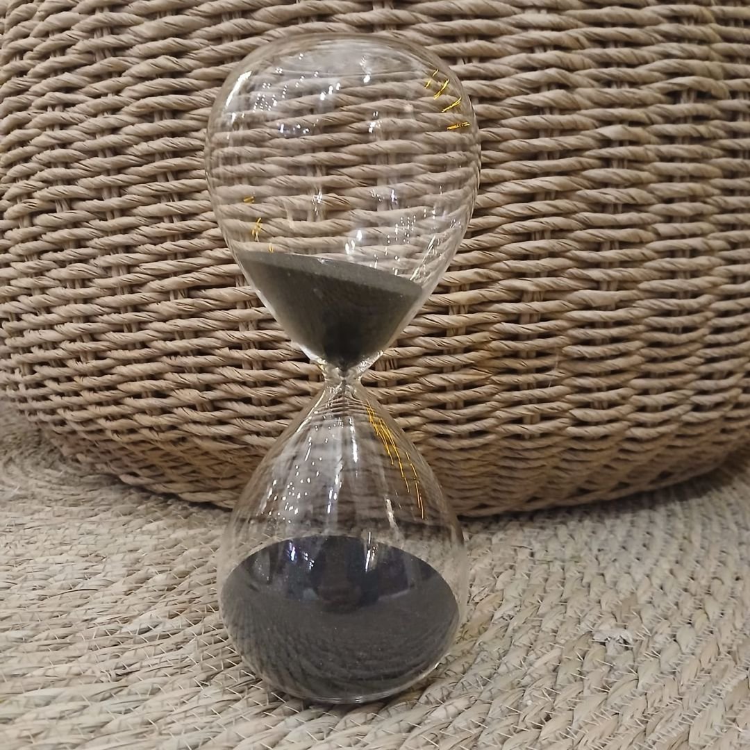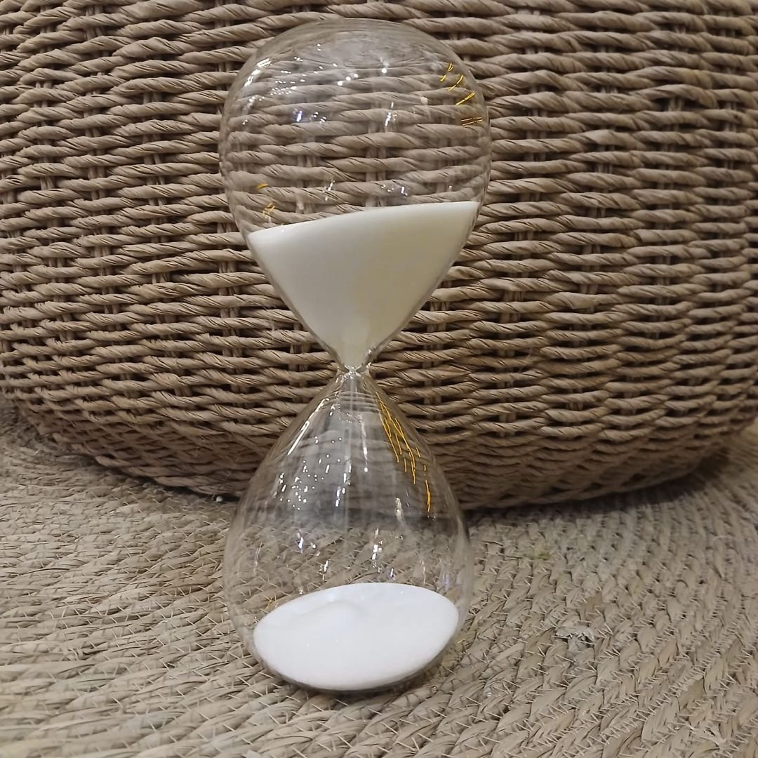 Reloj de arena de vidrio chico. Ideal para decorar tus espacios.