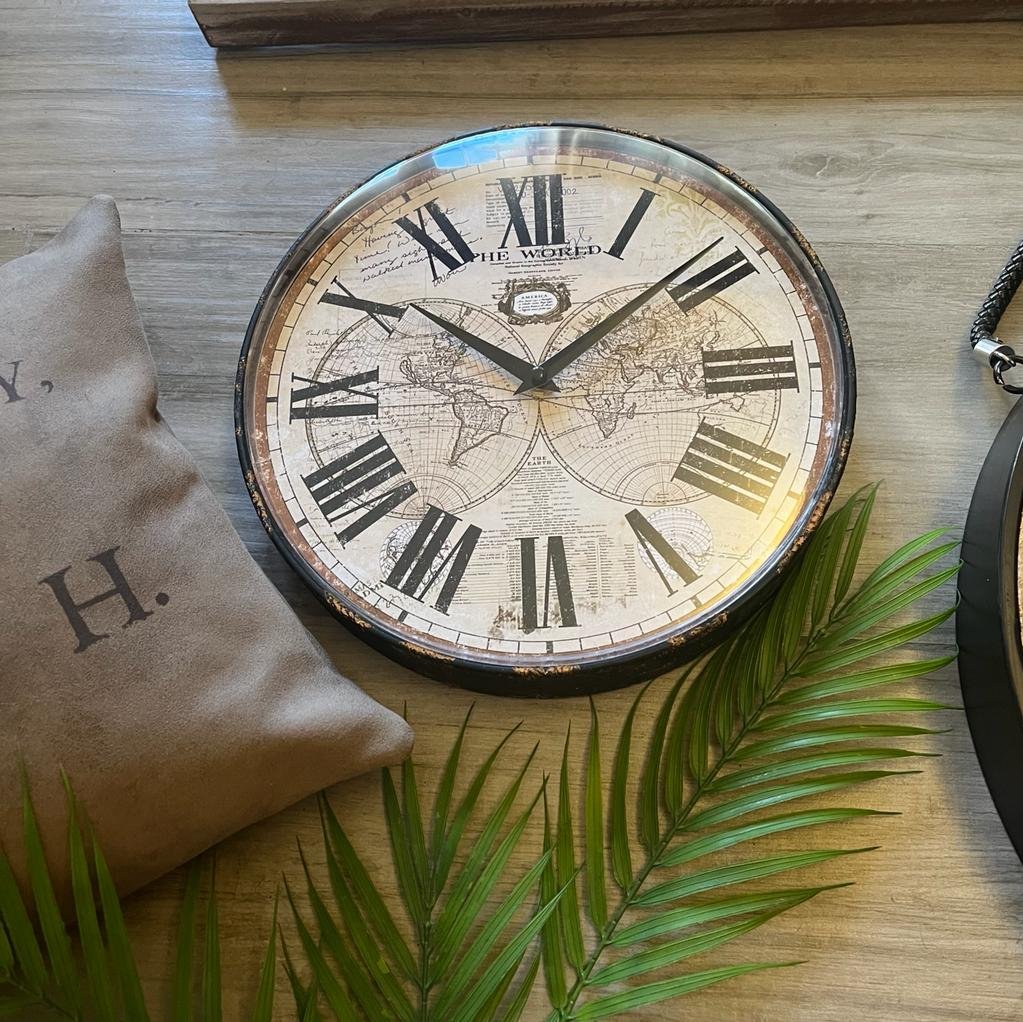 Reloj de pared mapamundi de metal y frente de vidrio 30 x 30 x 5,5 cm