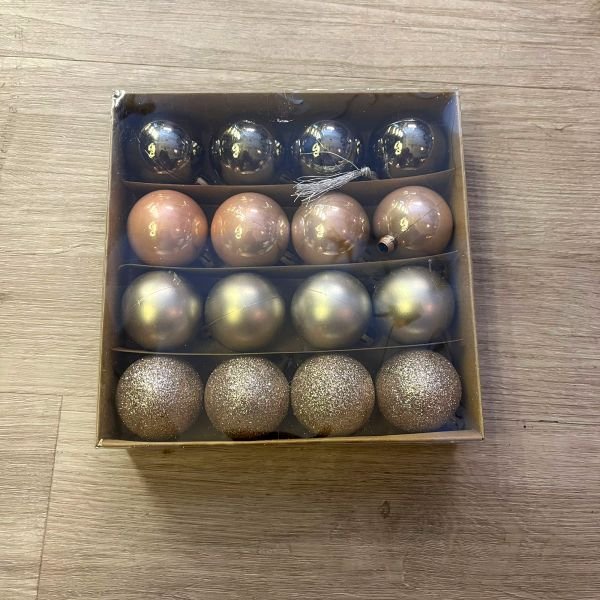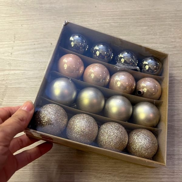 Set de 16 bolas / esferas chicas para arbol de navidad en tonos rosados y dorados