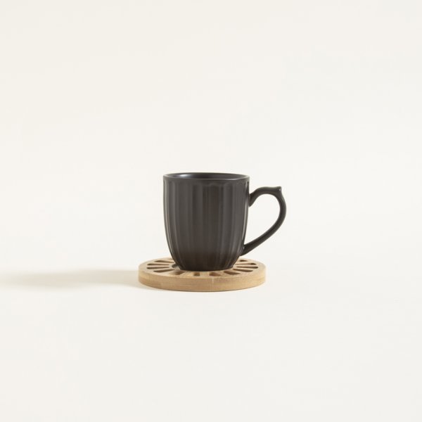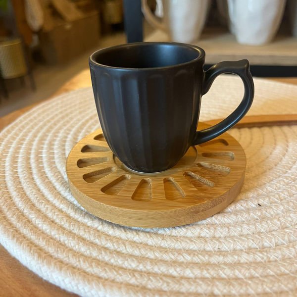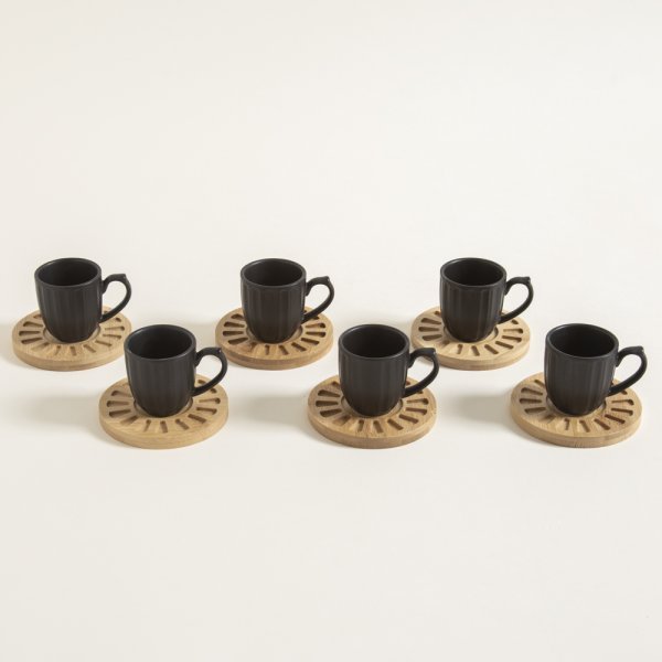 Set de 6 tazas de porcelana negra rayada con plato de bamboo