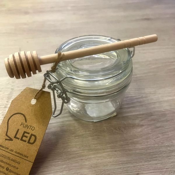 Set Frasco redondo de vidrio con tapa, herrajes metálicos y cierre hermético con cuchara mini de Madera para Miel es ideal para extraer la miel de los recipientes pequeños igual conserva la pureza sabiendo que no se combinaran sabores con otros utensilios de la cocina.