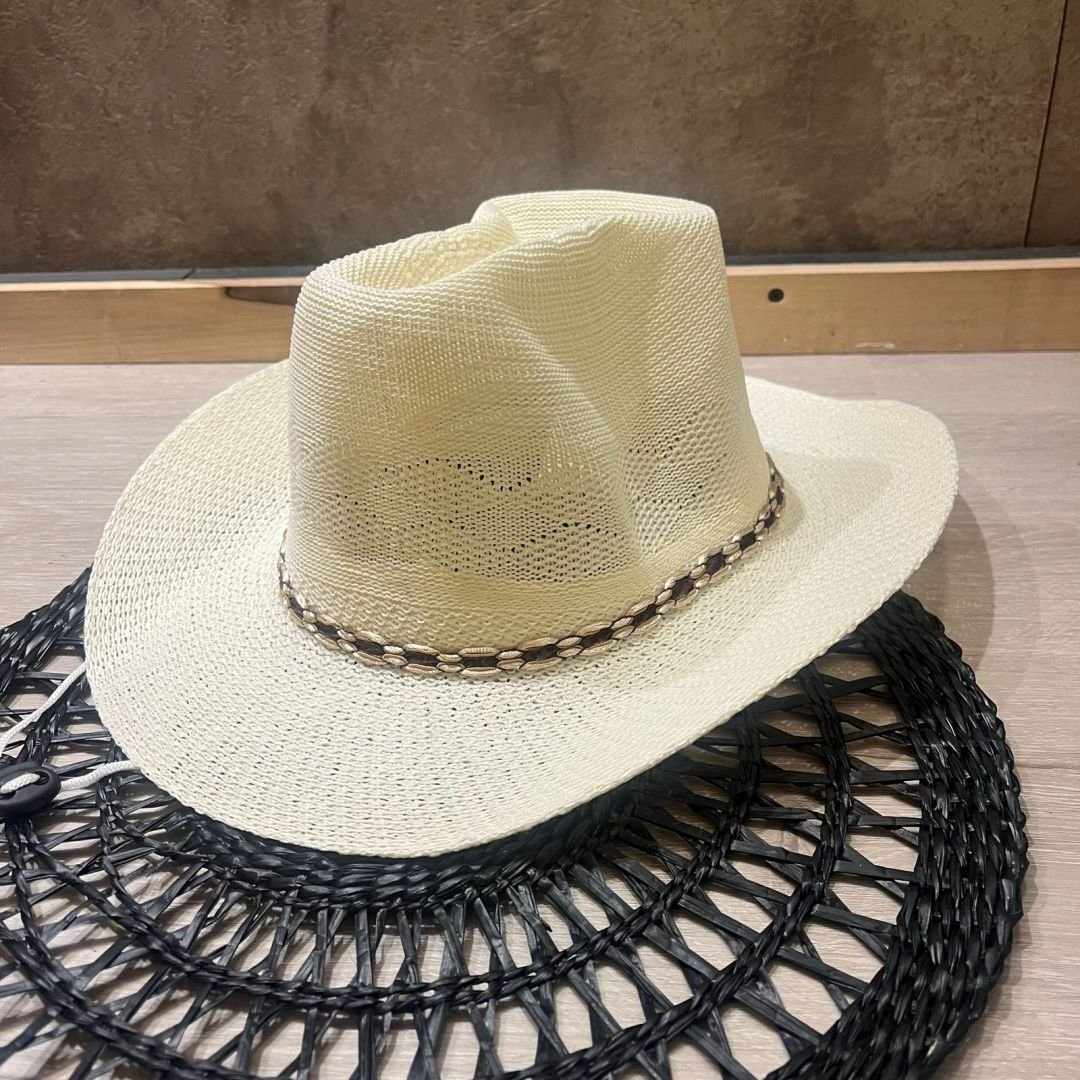 Sombrero de polyester tramado blanco con faja combinada y cordón para sujetar