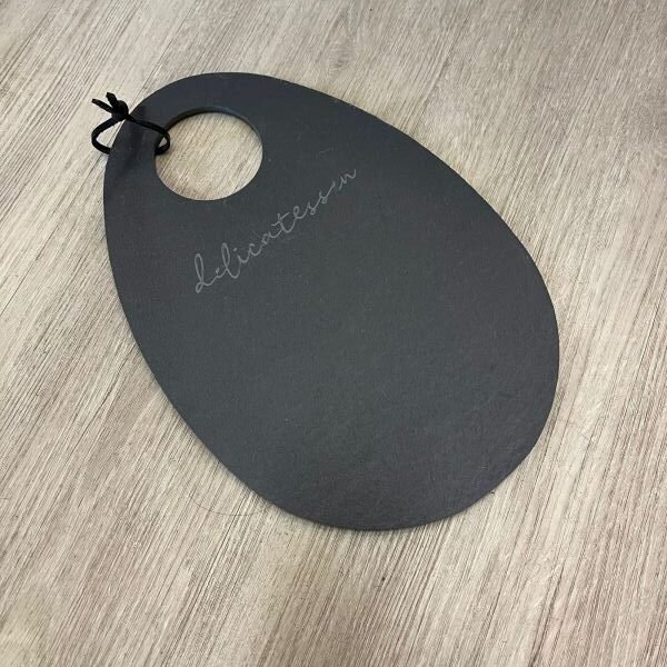 Tabla de piedra de laja color negra de 33 x 23 cm con orificio para un mejor agarre y colgado.