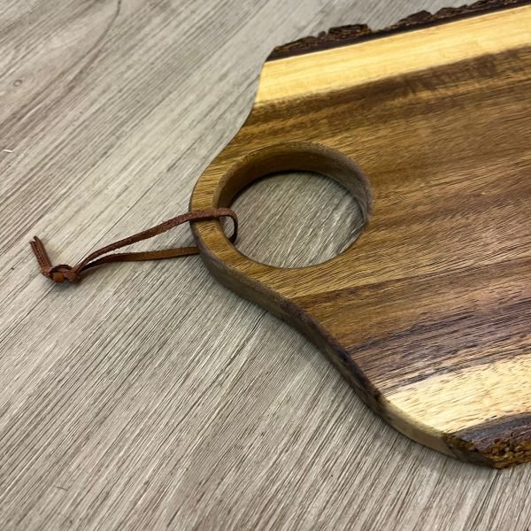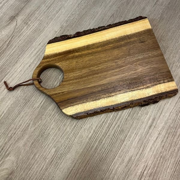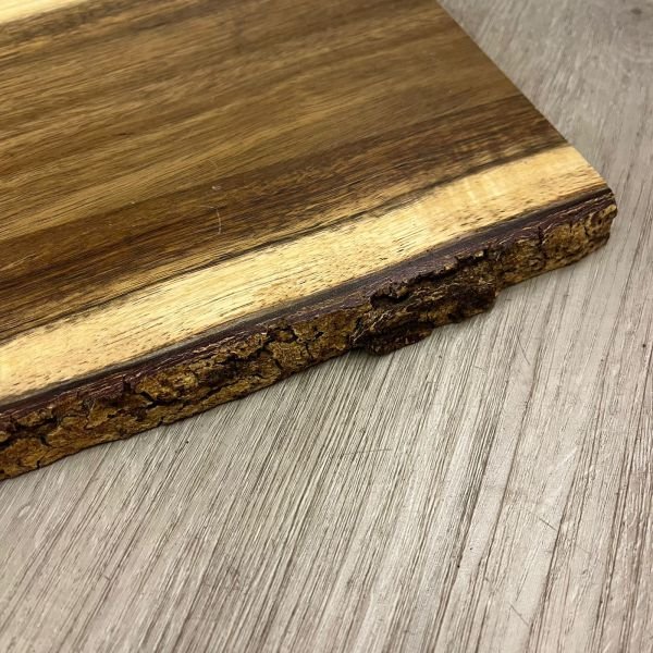 Tabla realizada en madera de acacia con corteza y lustre natural.