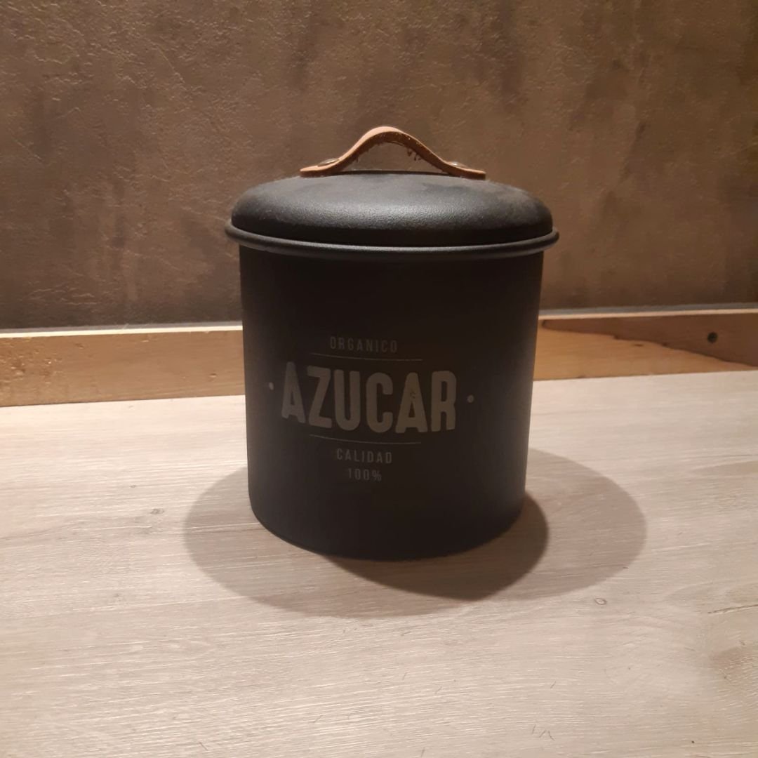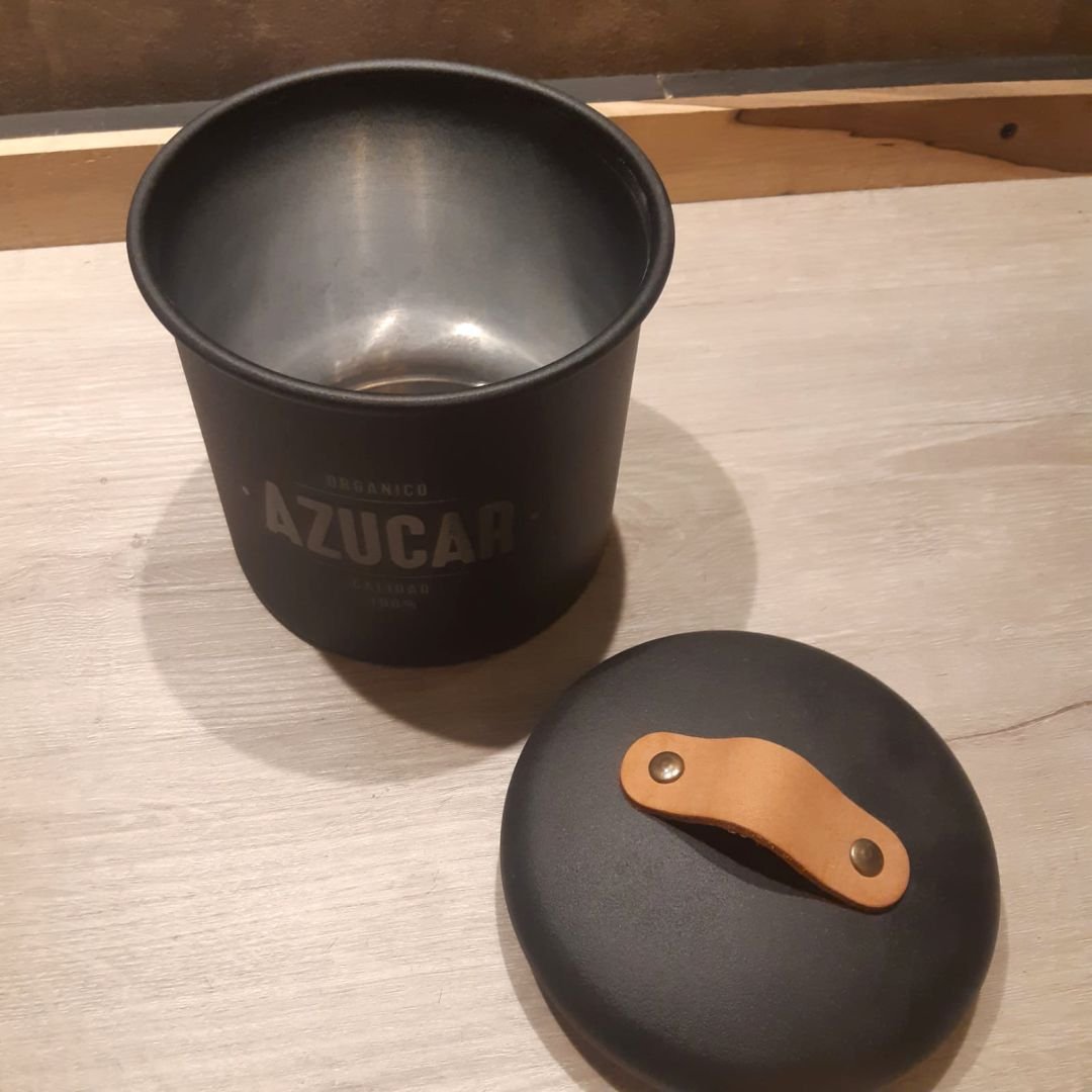 Tarro de metal negro texturizado con tapa y agarre de cuero para azucar