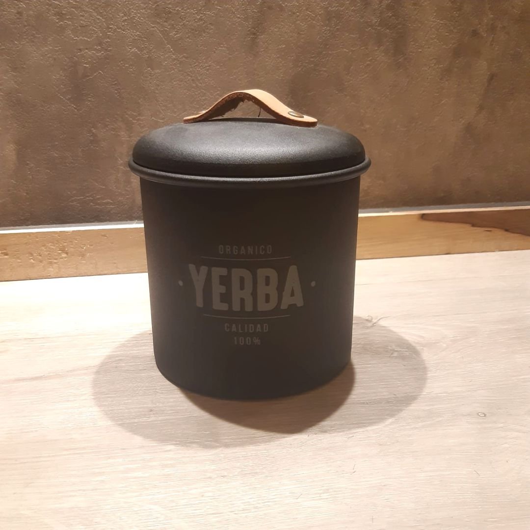 Tarro de metal con tapa hermética y agarre de cuero para yerba de 17 x 17 cm