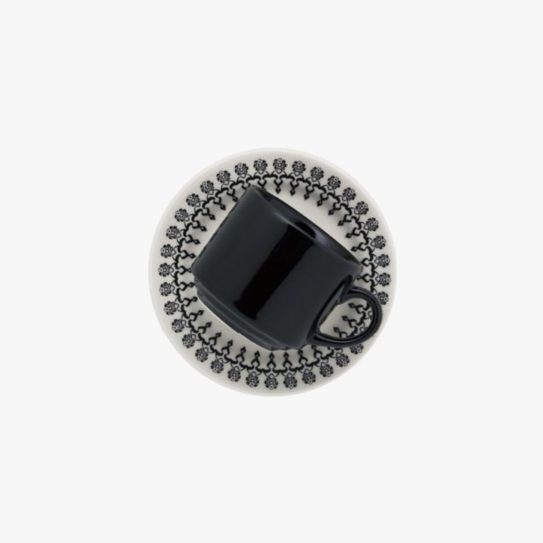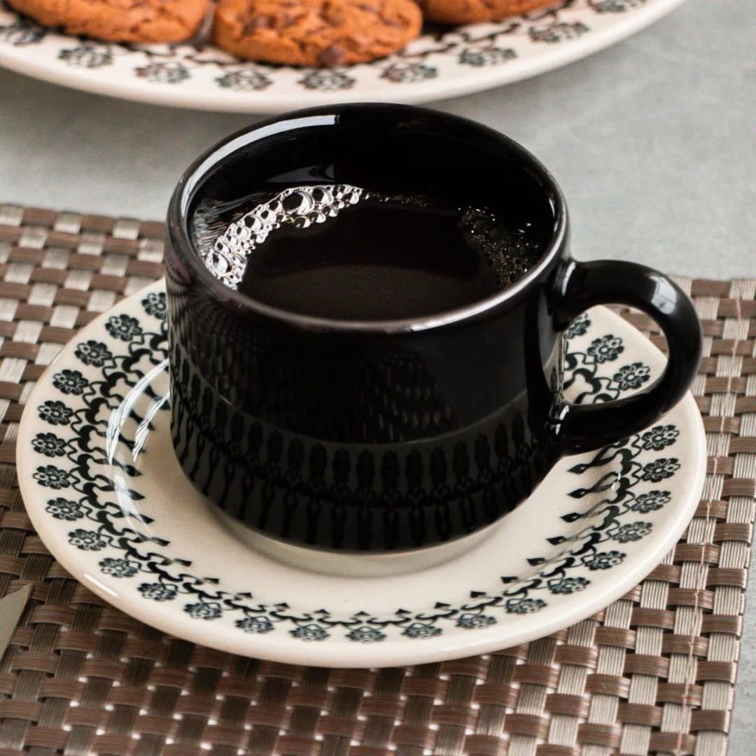 Taza de te color negra con plato color blanco con una terminación de borde del plato decorado.