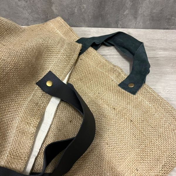 Tote bag / bolsa de arpillera forrada con liencillo natural y manijas de cuero de 42 x 37 cm