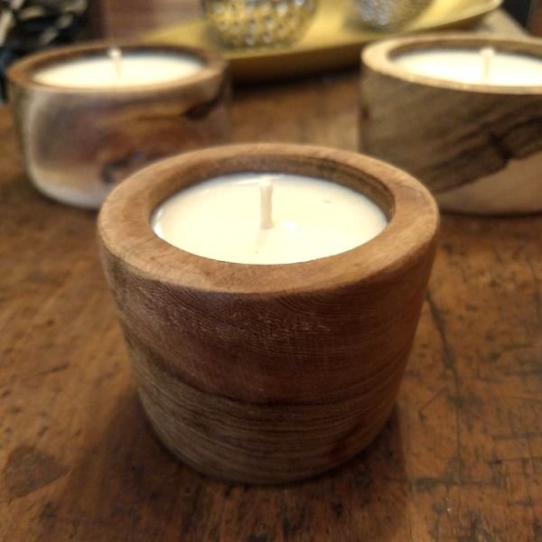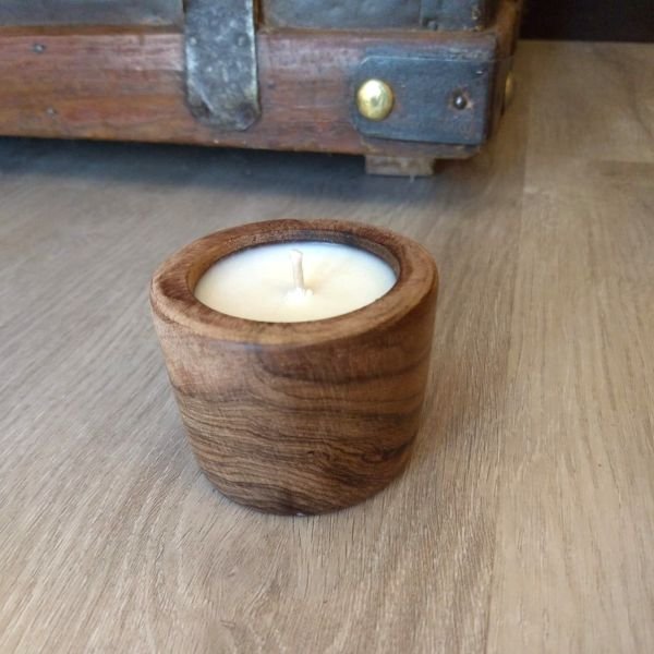 Vela de cera de soja en cuenco de guayubira de 6 cm con aceites esenciales