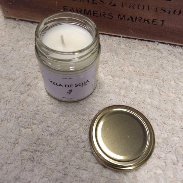 Vela de soja aromatica en frasco de vidrio con tapa metalica dorada