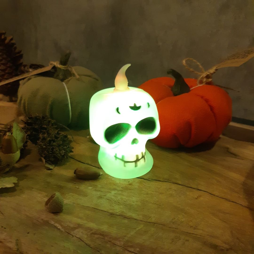 Vela led calavera Halloween luz multicolor a pila de 4 x 8 cm