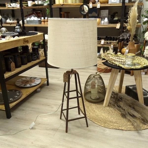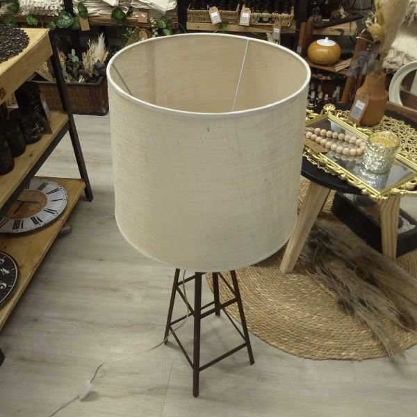 Velador artesanal de hierro con pantalla de arpillera natural de 36 x 90 cm