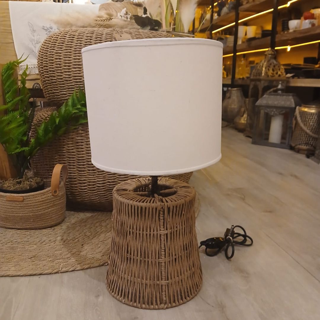 Velador hecho a mano en Hierro e hilos kraft, con pantalla en color crudo.