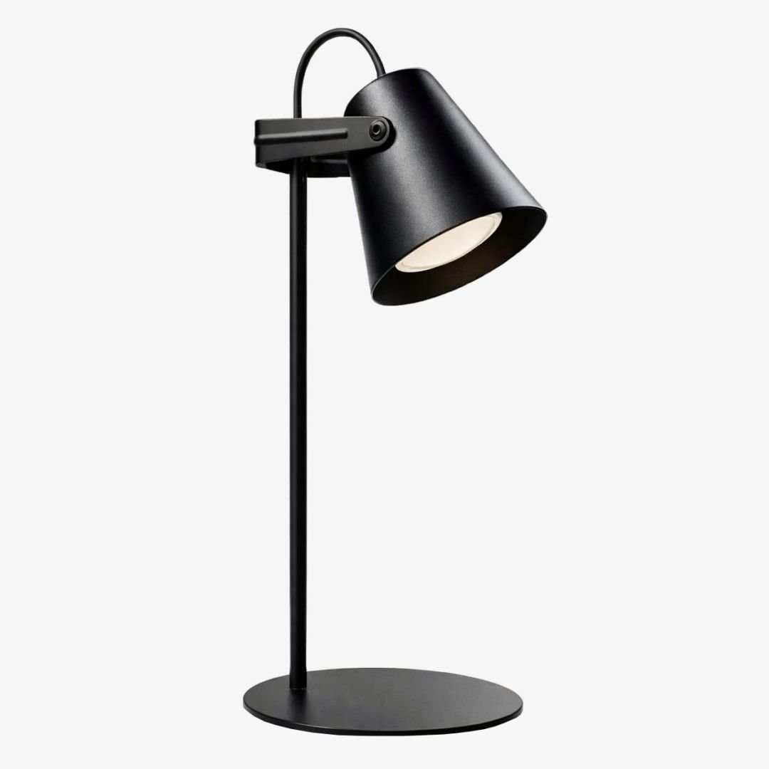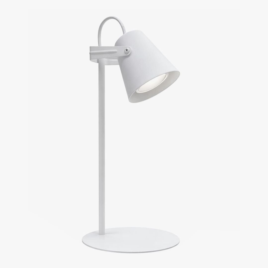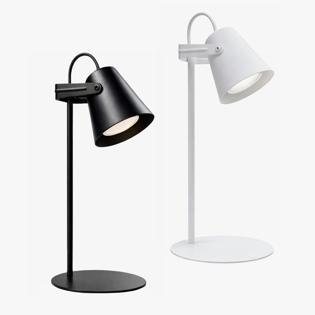 Velador de escritorio metálico con base circular y cabezal móvil disponible en color negro o blanco.