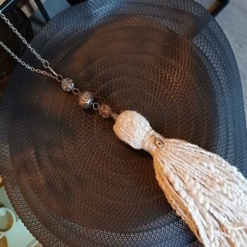 3 cuotas s/interés de $5650 -20℅ off en efectivo $13560Borla sujeta cortina de hilos de algodón color crudo con dije tipo cristal colgante y cadena plateada. Por unidad.