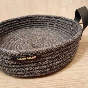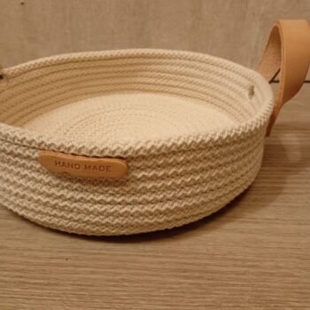 3 cuotas s/interés de $6233 -20℅ off en efectivo $14960Cesta bandeja redonda de fibras de algodón natural con manijas de cuero