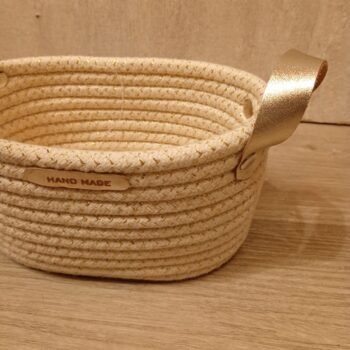 3 cuotas s/interés de $7713 -20℅ off en efectivo $18512Cesta ovalada de fibras de algodón natural con hilos dorados y manijas de cuero