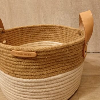 3 cuotas s/interés de $14513 -20℅ off en efectivo $34832Cesta redonda combinada con fibras de algodón y yute natural y manijas de cuero