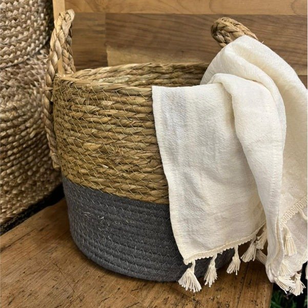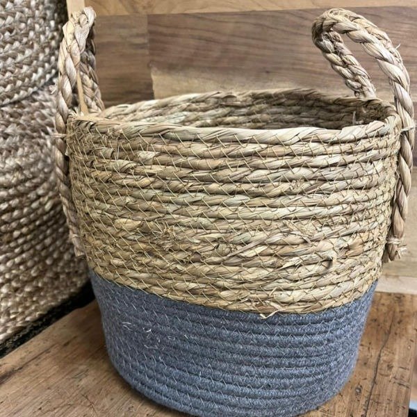 Cesta combinada mediana de Yute natural y gris azulado con manijas de 25 x 23 cm